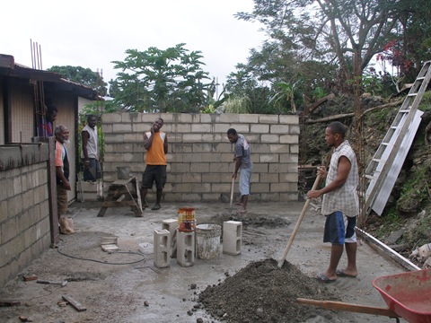The walls are going up in the new outdoor kitchen area. The crew was busy laying block today. We are making good progress – just wish we had another week before the next school term starts. Next Tuesday the students will be back in class and the work will continue part-time. We have changed our minds on some of the materials we were going to use, mainly the wooden posts and beams. Since we discovered that the termite damage has spread from the old kitchen roof to the attached main cafeteria building, we do not want to use wood in the new kitchen roof. Our tropical termites are voracious and we would rather not entice them with another free meal! It is going to cost us more but we would like to raise the extra funds and use metal beams with the metal roofing instead. Thank you for your support!