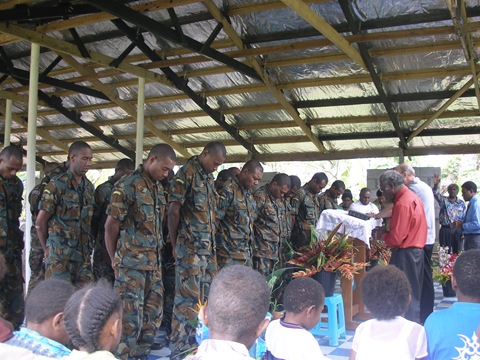 This morning at Fresh Wota Assembly a group of newly trained military men and women were attending service. Their commanding officer had brought them to service and requested a special prayer of installation for them. Gary prayed and Rev. Raymond Clay, senior pastor of the church, is standing beside him.