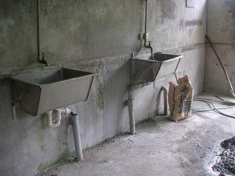 The photo below shows the two original washtub sinks which sit parallel to the new wall. I missed getting a Laundry sinks beforegood “before” photo of the sagging plywood shelves which the students used as counters. The guys were so eager to get started that everything was torn out in record time! When this project is finished there will be a total of four sinks for washing clothes, new tiled counters and the unfinished walls will be plastered.