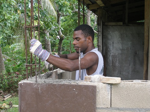 JimmyThe veranda outside the boy’s bathroom is currently getting a facelift. This is where the male students hand wash their clothes. On the right, is a photo of Jimmy, a first year JBI student, working on the new partial wall which is going up on the veranda to accommodate two new washtubs and counters.