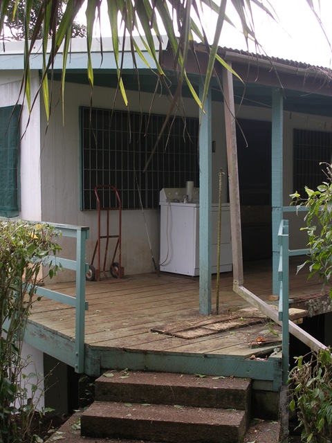 porch removedAs you can see from this recent photo, the termite eaten wooden back porch has been removed and a smaller one needs to be constructed.