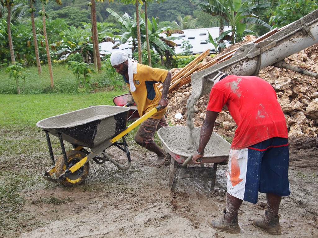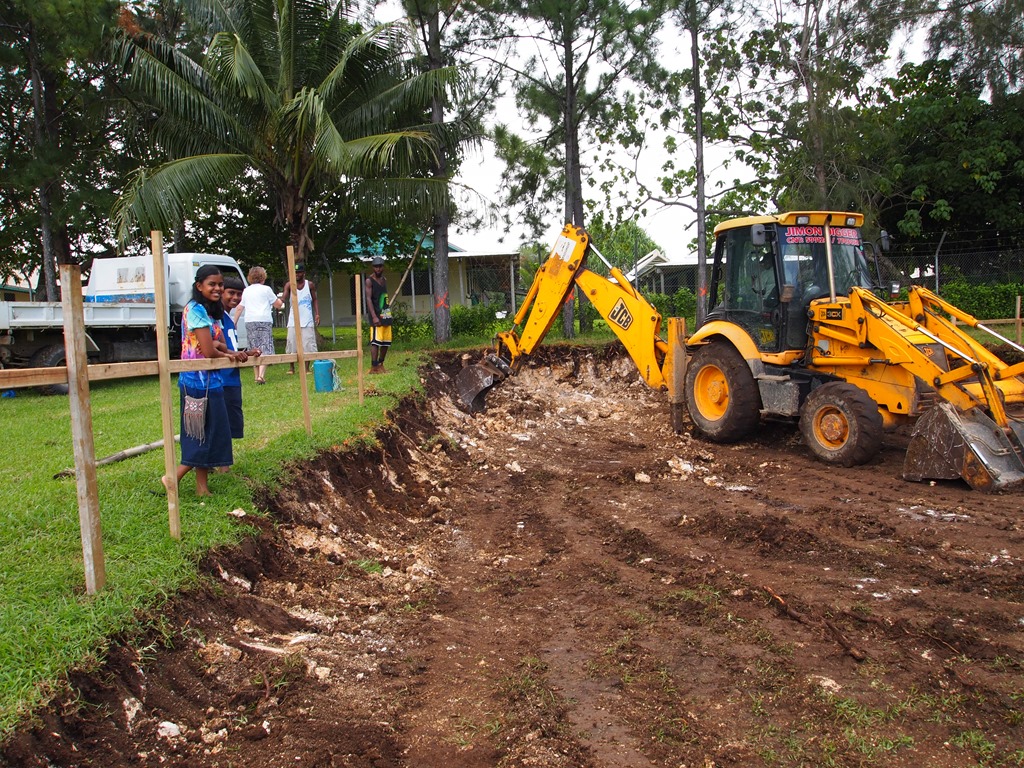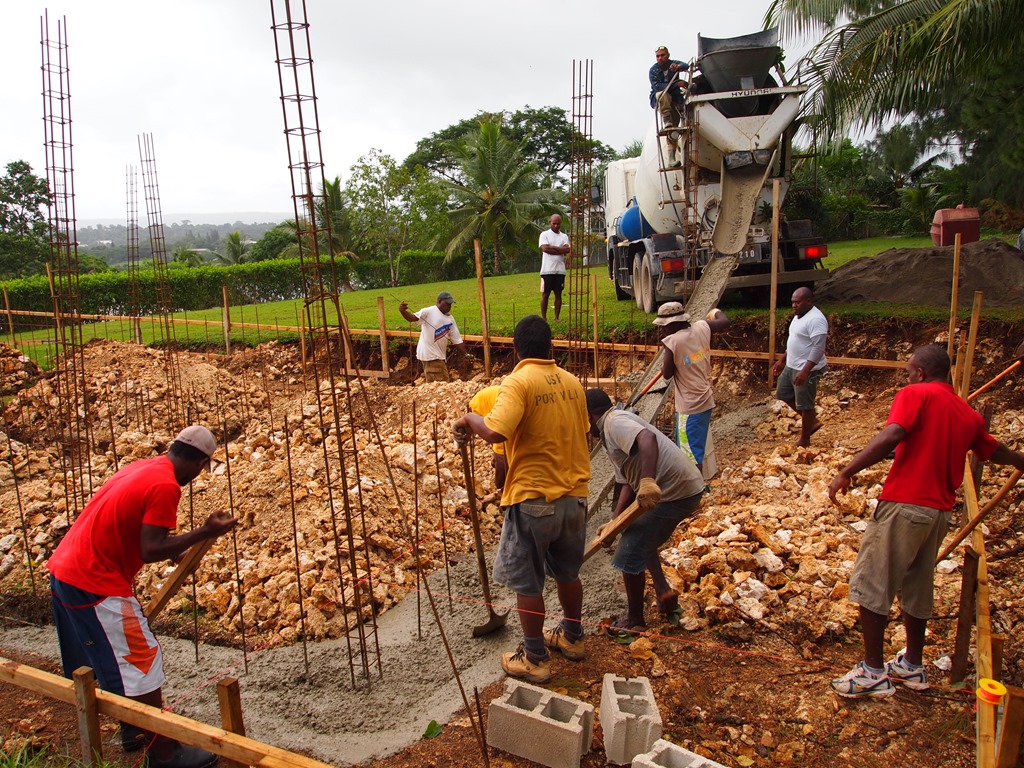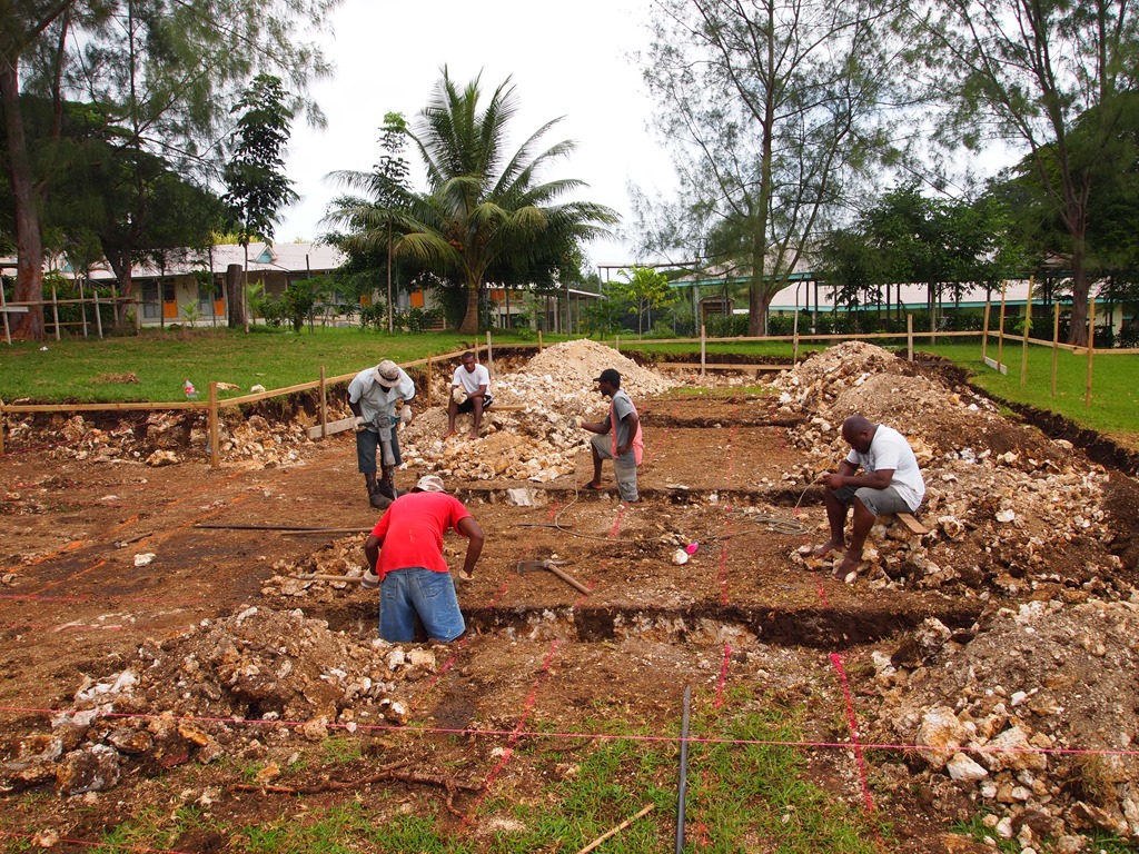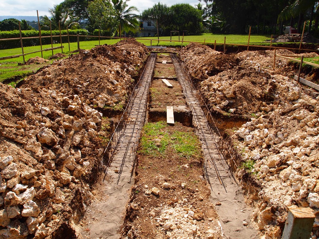 As soon as I had the building permit in hand, the guys started to clear the site. We are building at the top of the hill on a site which was excavated years ago for a mission house but never built. A big thank you to Graeme, an engineer, who answered my SOS over his lunch hour and gave me some expert advice and reassurance on the site elevations. Due to the varying elevations the site needed further excavation work. Then the guys spent 2 weeks with a jackhammer breaking through the solid coral stone to make foundation trenches. That was not a pleasant job and everyone was glad to get it done!