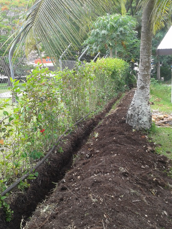 In order to connect the new JBI house with city power and water, we have to dig a 721 feet (220 meters) trench all the way down to the main road. Then lay that length of electrical cable and water pipes down the hill. When everything is finished the utility company will install the new utility meter. Several people have put their shoulders to the shovel and worked long hours on it. There are a couple of places where we will have to rent a jackhammer to break up the hard coral rock but the work is coming along nicely.