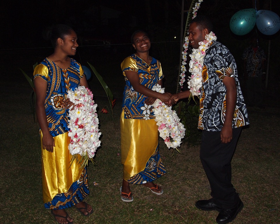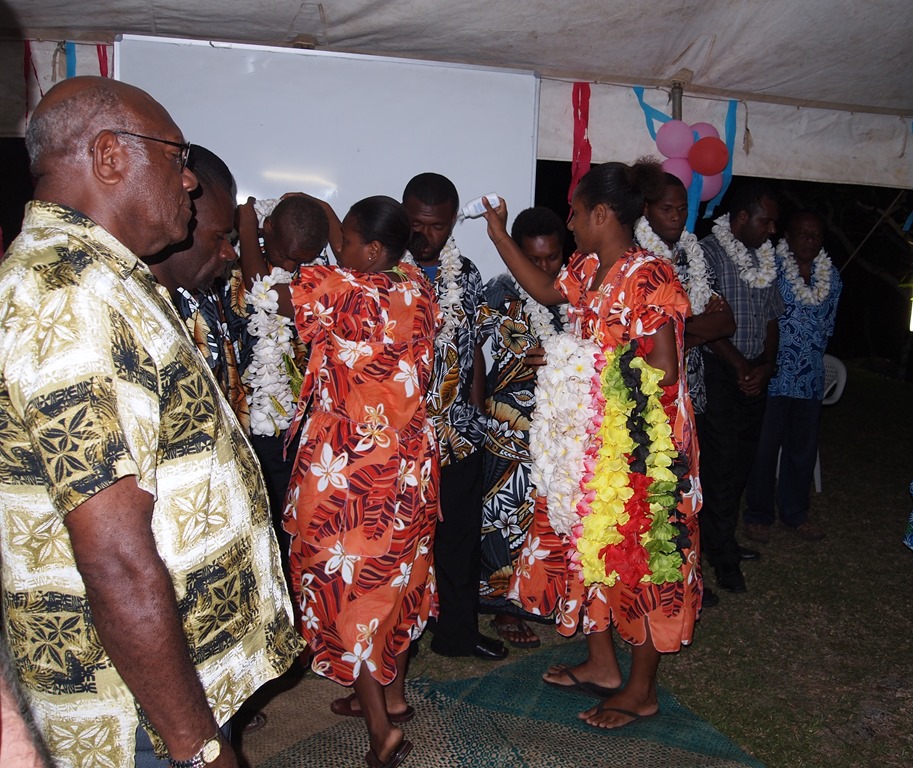 (Photo above on left) The welcoming committee gave salusalu (flower leis) to the graduates, school faculty and board members. That was accompanied by a good dousing of baby powder on the head and neck…