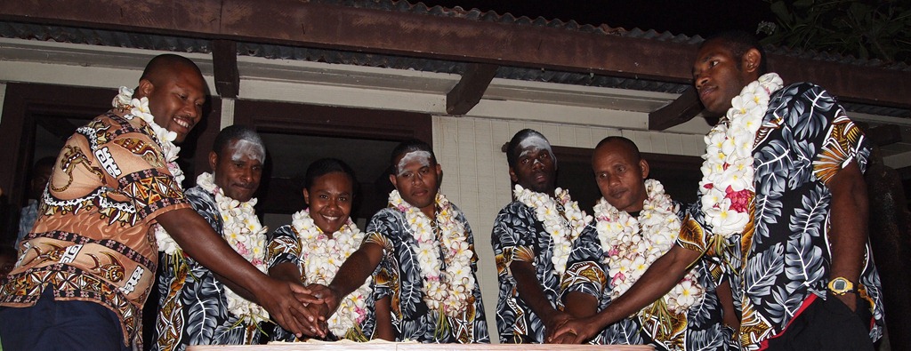 2012 Graduates: Micknie Natu, Hosea Katipa, Maturine Kaltakel, Freddie Bani, Abel Rete, Jask Jessie, Gino Bule, cutting the graduation cakes.