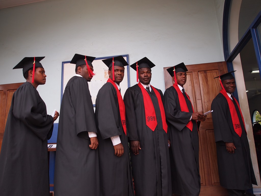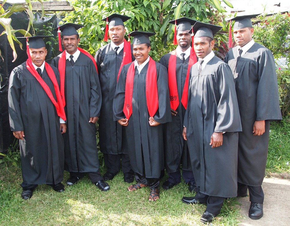 2012 Graduates (left to right): Jack Jessie from Solomon Islands, Hosea Katipa from Tanna, Micknie Natu from Maewo, Maturine Kaltakel from Efate, Abel Rete from Santo, Gino Bule from Santo and Freddie Bani from Santo. The five students wearing red sashes were awarded diplomas and the two others received certificates.