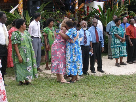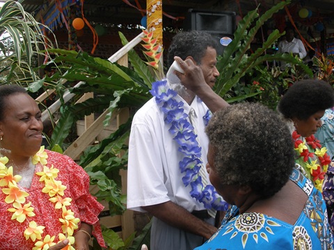 The Vanuatu welcoming ceremony is called Salusalu (corruption of the French greeting “Salut”) and consists of a flower lei being hung around your neck. The unique touch is that people will come around and also douse you with talcum powder and spray you with perfume. When you are well-scented you can return to your seat!