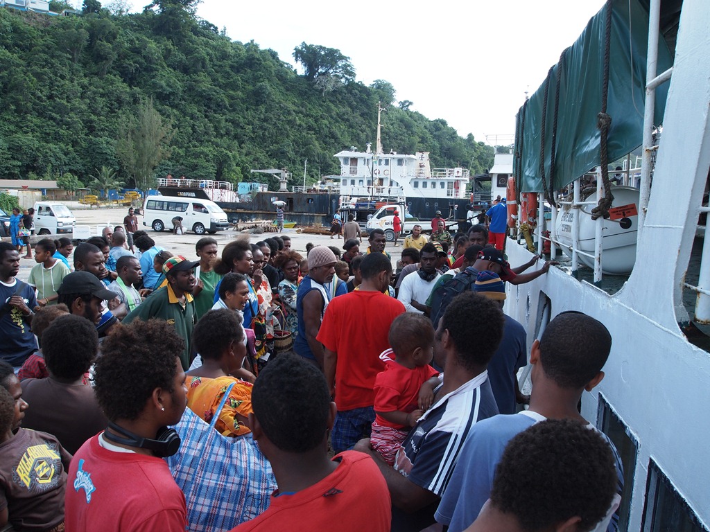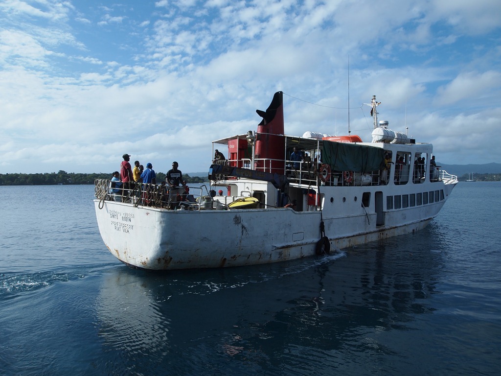 Twenty JBI students have headed to Santo today for a two week mission trip. Yesterday, they were all ready to set sail but a severe weather front kept the ship at port. This morning it was still very stormy but by afternoon the sun was shining as the “Santo Queen” left port with 18 happy students, spouses, six puppets, boxes of literature, and a whole lot of baggage!