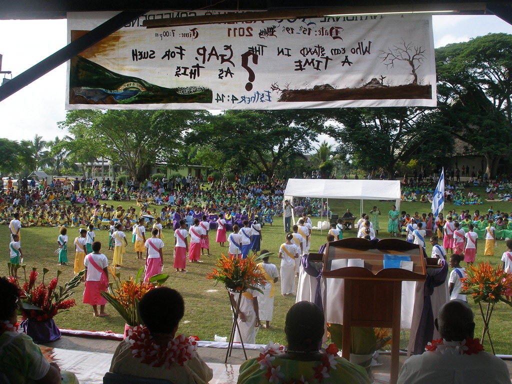 The Conference opened with Royal Rangers raising the Vanuatu flag and a group of Missionnettes doing an action song (Jasmine among them) and then welcome speeches. Mrs. Natapei, the former Prime Minister’s wife graciously came and officially opened the conference on behalf of the government. The mass AG youth choir did a great job under the direction of Matilda. Mrs. Beverly Komasi, wife of AG Supt of the Solomon Islands, was the opening speaker. The conference theme is, “Who Will Stand In the Gap For Such A Time As This?” So things got off to a great start!